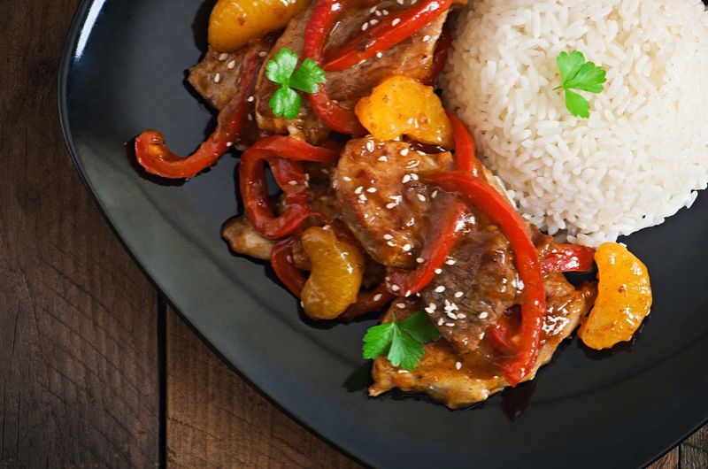 3. Add finely chopped red peppers, two dessertspoons of soy sauce, tangerine and sugar, and mix.