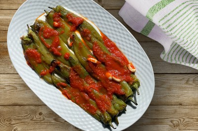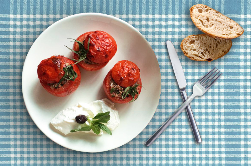 3. Fill the tomatoes with the mix you prepared. Add half a glass of water over the tomatoes. After distributing the butter onto the tomatoes, place the lids.